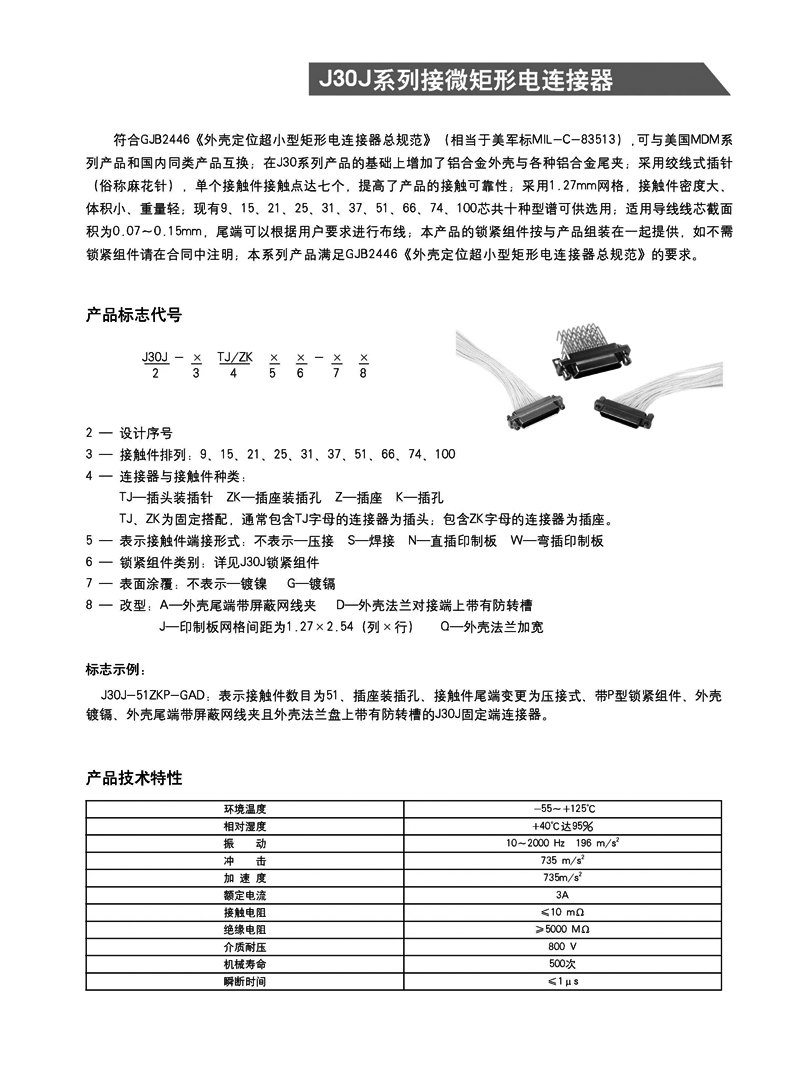 25,31,31,37,51,66,74,100芯十種規(guī)格,采用絞線式彈性插針(麻花針),接點密度高,產(chǎn)品性能符合GJB2446的要求。