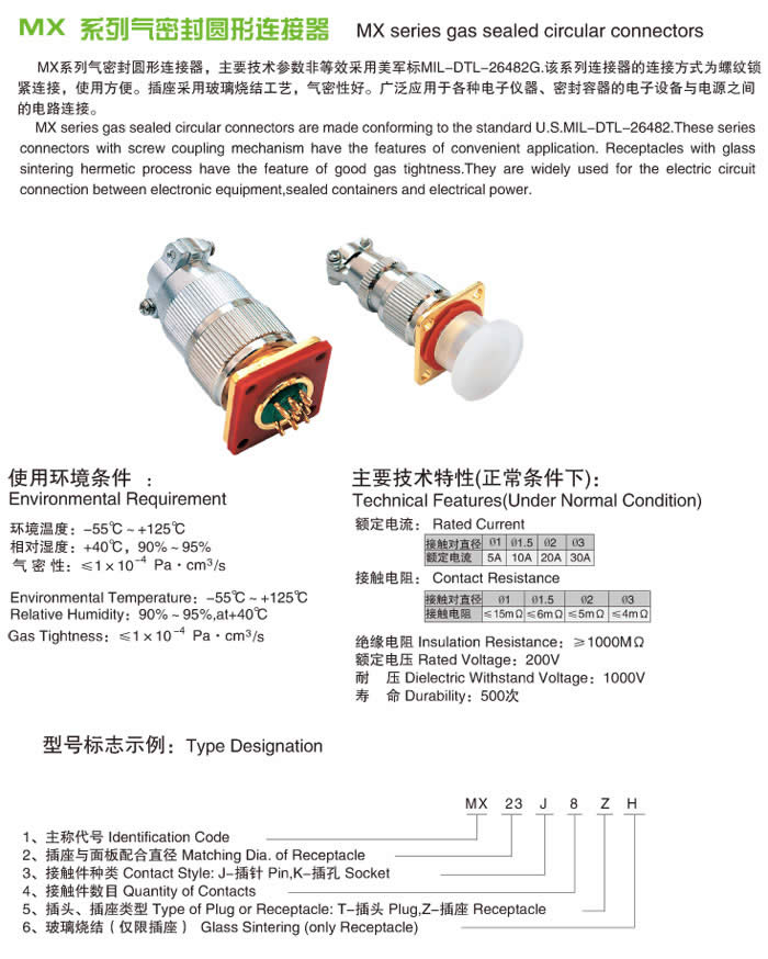 MX系列氣密封圓形連接器,主要技術(shù)參數(shù)非等效采用美軍標(biāo)MIL-C-26482G。 供航空,航海及其他密封容器中電子設(shè)備與電源.電氣間連接,導(dǎo)線與電纜間電氣連接用。連接方式為螺紋連接鎖緊機(jī)構(gòu),使用方便。插座采用玻璃燒結(jié)工藝,氣密封性高,屬于儀器式電連接器。