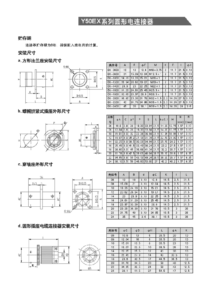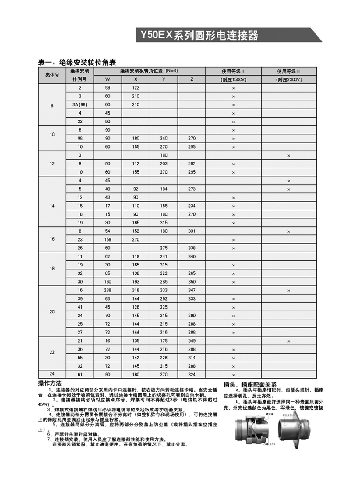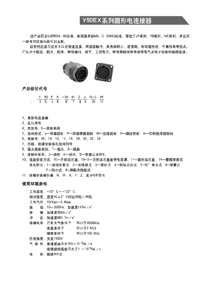 Y50EX系列圓形航空頭采用卡口式連接系統(tǒng),具有快速控接和快速分離,體積小、重量輕等特點。插頭有多種電纜安裝形式,即:電纜夾線板式、簡易封裝式、接地壓緊式、防波抗拉式、彎頭護線式、電纜話筒式和彈簧護線式等。電纜出線口備有各種規(guī)格不同的密封橡膠護線縣,能與電纜線緊密配接,增強了電纜線和連接器插頭的防雨、防水、防塵密封性和抗拉性能。接觸件焊接,殼體有屏蔽和非屏蔽以及多種鍍層可選,插座有一般密封和玻璃燒結(jié)密封等類觀,以適用不同的工作環(huán)境。適用于戰(zhàn)略戰(zhàn)術(shù)系統(tǒng),電子對抗系統(tǒng),野外作業(yè)電能,通訊信號連接系統(tǒng),航大航空航海通訊和測試跟蹤系統(tǒng),計算機系統(tǒng)、郵電鐵路指揮系統(tǒng),進口醫(yī)療儀器設備等電能、電訊信號的近接。
