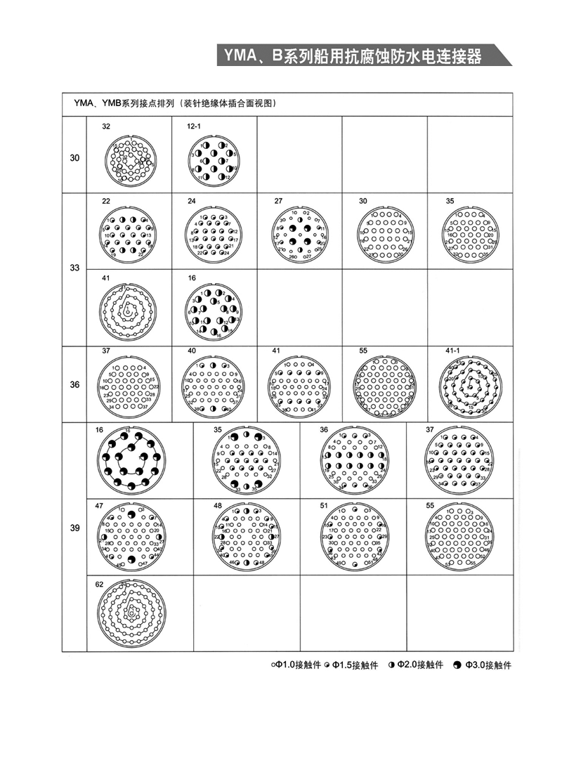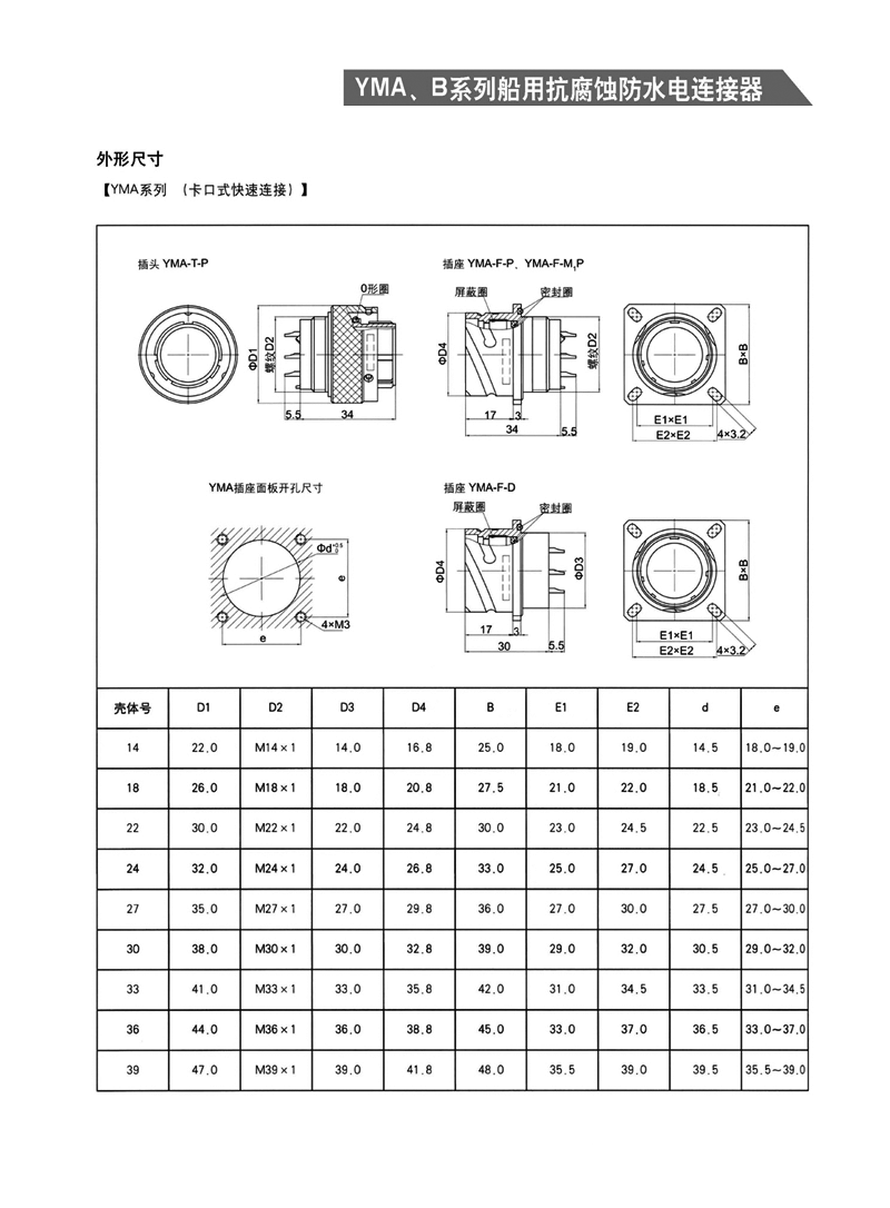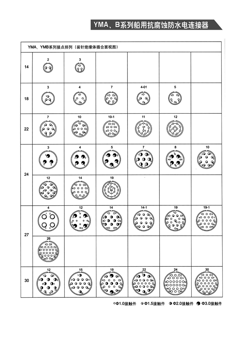 YMA YMB圓形防水防腐航空插頭,適用于濕熱、浸水等惡劣環(huán)境,可耐50米水深密封,耐1000小時(shí)鹽霧試驗(yàn):YMA系列為卡口式快速連接,YMB系列為螺紋防松連接,頭座均為焊接。 YMA、YMB系列船用抗腐蝕防水電連接器 1.【概 述】 * YMA系列—— 卡口式快速連接 * YMB系列—— 螺紋防松連接 * 適用于潮濕、浸水等惡劣環(huán)境下的設(shè)備與電纜、電纜與電 纜之間的電氣連接 * 可耐50米水深密封 * 插頭插座端接方式均為焊接 * 五鍵定位具有盲插和防錯(cuò)插功能 * 高可靠的雙曲面線簧插孔使連接器插拔柔和,接觸電阻小 * 插頭、插座既可裝針,也可裝孔 http://www.newyield.net/Product/yuanxinghangkongchatouhangkongjiechajian/