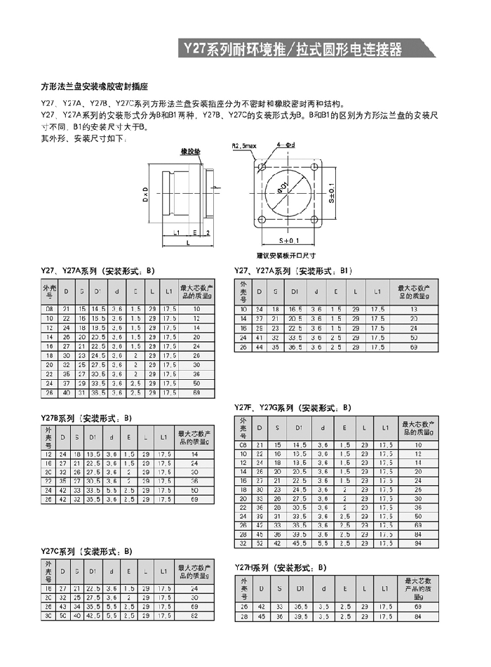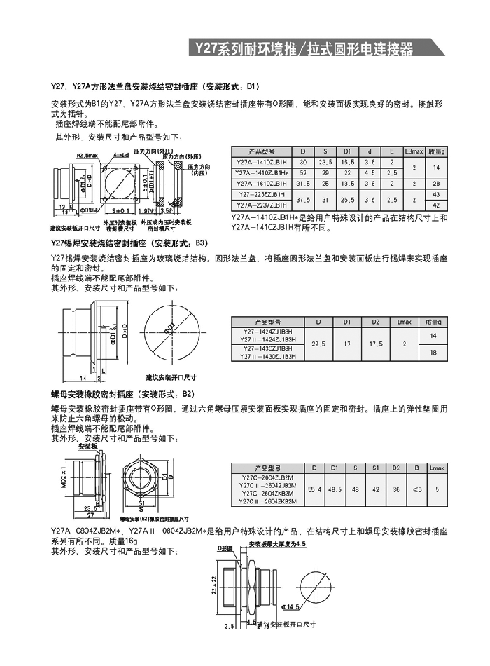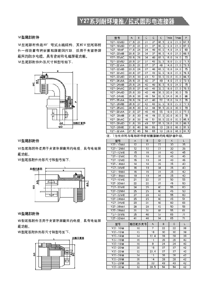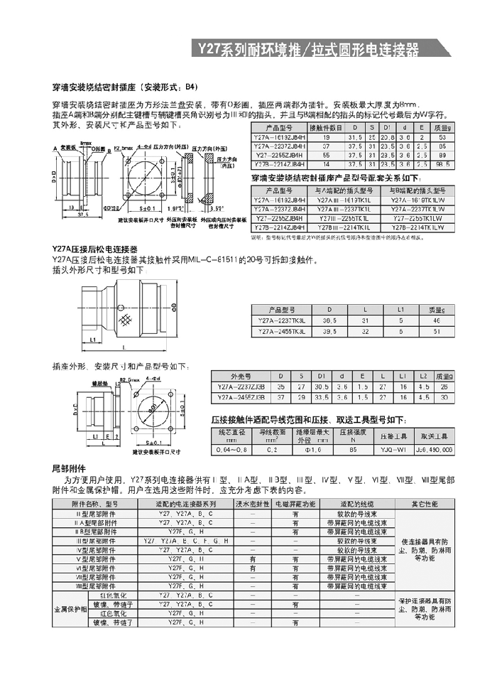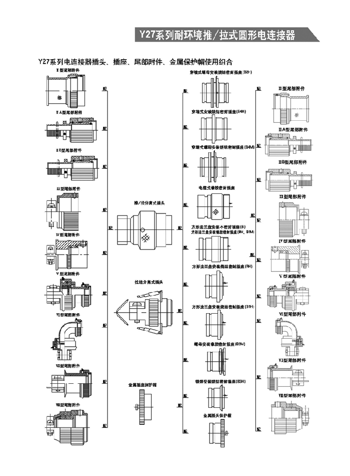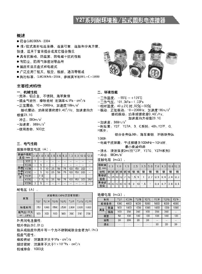 Y27系列耐環(huán)境推/拉式圓形航空插頭 ,采用推/拉式鎖緊機構,材料為鋁合金、海軍黃銅和不銹鋼三種,共有13種殼體號,1~121等18種芯數,有3~250A等10種電流規(guī)格。Y27A系列電連接器有壓接后松的品種。Y27F、G、H系列電連接器適用于艦船環(huán)境,具有防水密封的性能。Y27H系列電連接器采用雙曲線插孔。符合國家軍用標準GJB2905-97,性能參照美軍標MIL-C-38999。 該系列航空插頭連接和分離方便、快捷,適用于盲目插合或其他插合情況,具有抗振動、防鹽霧、防電磁干擾的性能,有防塵、防雨及氣體密封等品種。Y27系列電連接器廣泛應用于航天、航空、船舶、通訊等領域。