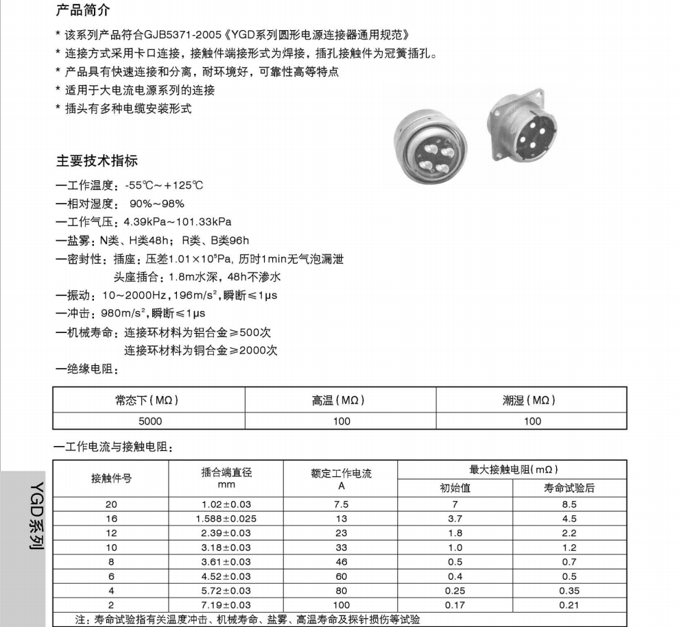 該系列電連接器是符合GJB5371-2005規(guī)范,適用于大電流電源系列的連接,現(xiàn)在的新能源汽車(chē),電動(dòng)車(chē),充電樁, 鋰電池,發(fā)動(dòng)機(jī)等電源設(shè)備的電流線路連接。芯數(shù)的多少不一樣,匹配的電流大小也不一樣,冠簧插孔,接觸面積廣, 插拔柔和,可靠連接。插頭和插座卡口連接,有二次鎖緊設(shè)計(jì)。