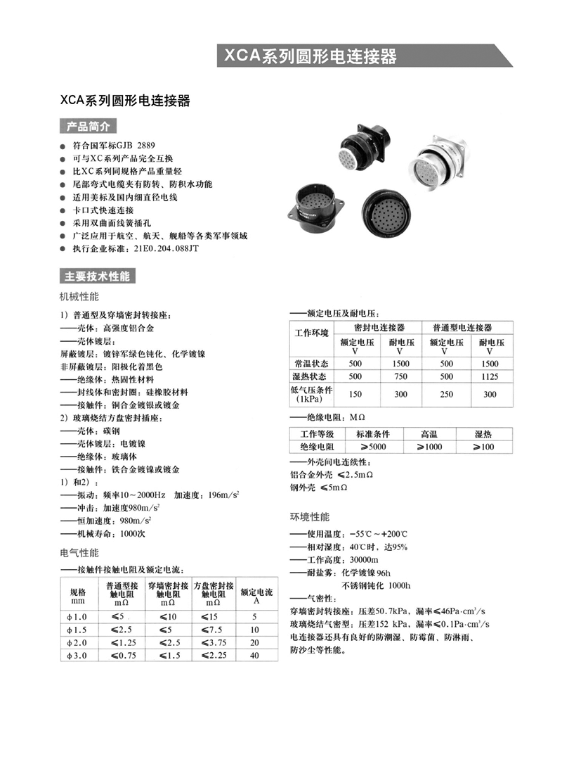 XCA系列航空插頭符合GJB2889標準,可與XC系列產(chǎn)品完全互配,具備比XC系列同規(guī)格產(chǎn)品重量輕的特點,殼體材料為高強度鋁合金,接觸件有后松后卸壓接式,其中插孔為線簧孔,具有插拔柔和、接觸電阻小、防潮、防鹽霧、防霉菌等特性,適用美標及國內(nèi)細直徑電線,尾部彎式電纜夾有防轉(zhuǎn)、防積水功能。XCA系列航空插頭廣泛應(yīng)用于航空、航天、兵器、艦船、野戰(zhàn)通信等軍事領(lǐng)域,以及郵電通訊、鐵路、計算機和各種儀器、儀表的線路連接。