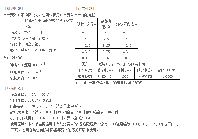 EX增安型防爆接插件,我公司先開發(fā)了4芯,8芯,12芯,15芯,32芯。有低電流,有高電流,插座有對接式,固定式。采用緊湊型 結(jié)構(gòu)設(shè)計,EXPlora系列系列防爆連接器一旦鎖緊環(huán)收緊后可達(dá)IP68等級的環(huán)境密封,不需要任何的補(bǔ)充密封。當(dāng)連接器沒有匹配使用時; 可以用帶高強(qiáng)度鋼絲繩的密封帽同樣可以達(dá)IP68等級。 螺母固定的接線端子可使用的導(dǎo)線最大達(dá)4mm2, 不需要任何特殊的工具進(jìn)行安裝和拆卸。位置鍵槽可以防止錯誤的連接。線纜固定夾以及可替換的密封線纜圈的兩種設(shè)計可接受7mm-22mm直徑的線纜。 主要用在各種需要一個安全,可靠,容易分?jǐn)嗟倪B接的應(yīng)用。尤其是在易爆燃性氣體可能存在的制造廠的機(jī)器設(shè)備以及系統(tǒng)供電場合; 也用在石油化工行業(yè);包括磨坊,糧倉,油漆或油墨廠家,木材加工廠,水泥廠,船務(wù)和污水處理。 Bulgin(包錦)這款防爆連接器也適用于外部電器設(shè)備,如馬達(dá),泵,燈光設(shè)備,過程控制裝置用在危險的廠家和工廠,或?qū)е乱兹? 氣體,蒸汽,薄霧氣體或易燃塵埃的爆炸環(huán)境。 |