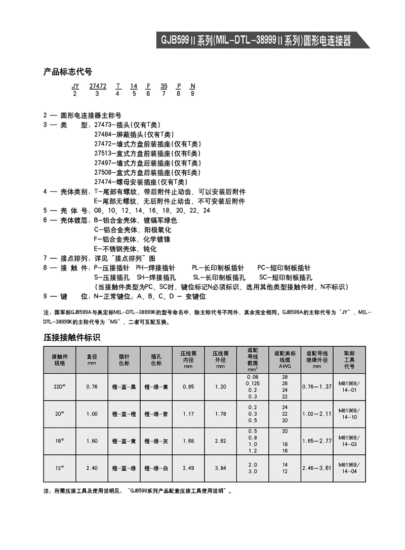 JY27473T14F19PN/SN圓形電連接器,是GJB599A(mil-dtl-38999k)標(biāo)準(zhǔn),體積最小,殼體端,適用于沒(méi)有高強(qiáng)度振動(dòng),沒(méi)有風(fēng)沙和潮濕的場(chǎng)合。