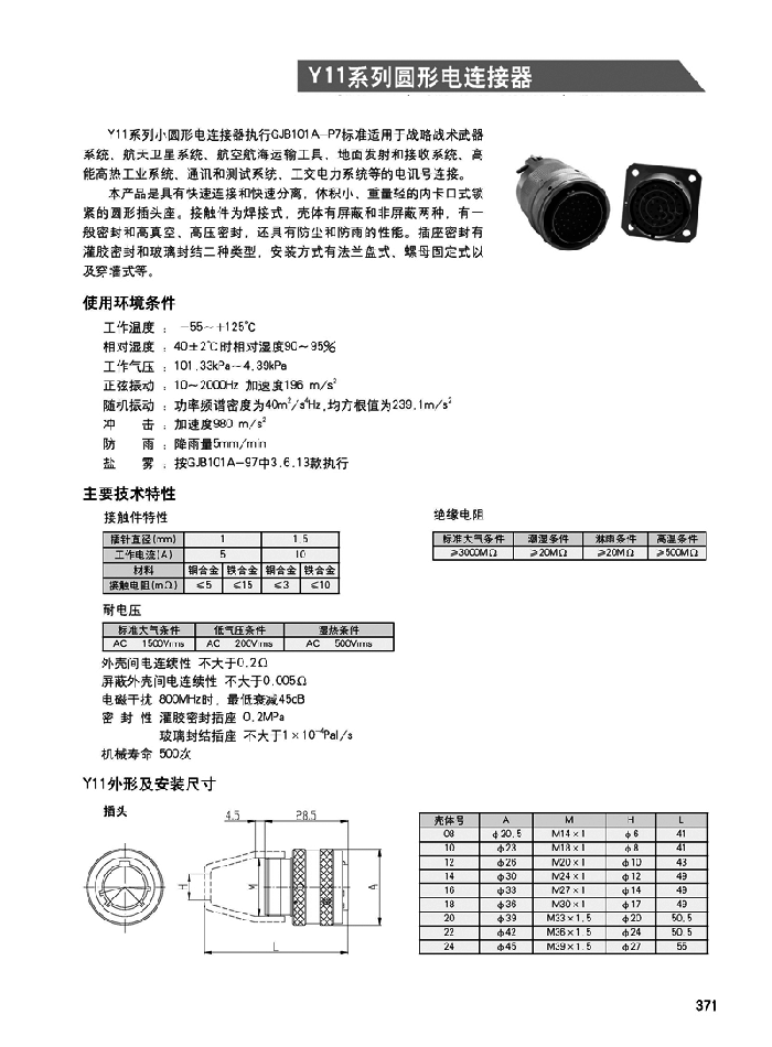 Y11X系列電連接器,航空插頭具有快速連接,快速分離,體積小,重量輕之特點(diǎn),采用內(nèi)卡 口式鎖緊方式,接觸件端接為焊接式,殼體有屏蔽與非屏蔽,功能多樣,規(guī)格齊全,符合GJB 101A-97要求。廣泛應(yīng)用于航空、航天、航海、野戰(zhàn)、戰(zhàn)車、工交電力、郵電通信、鐵路指揮 系統(tǒng)等電氣及電子設(shè)備的線路連接,并可根據(jù)用戶需求改裝成濾波連接器,真空氣密封連接器。