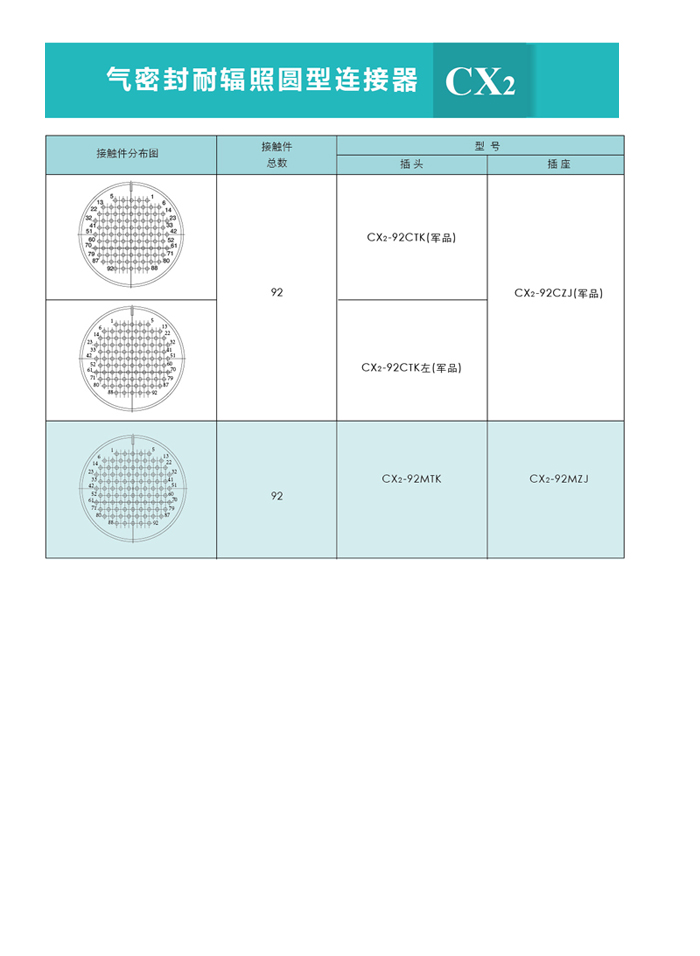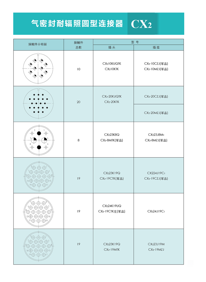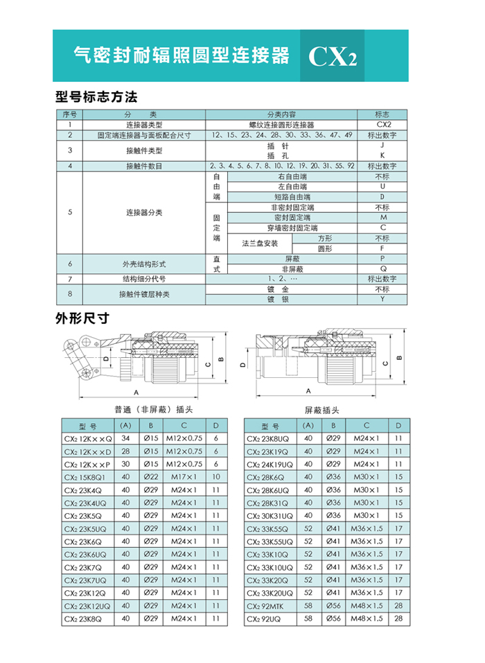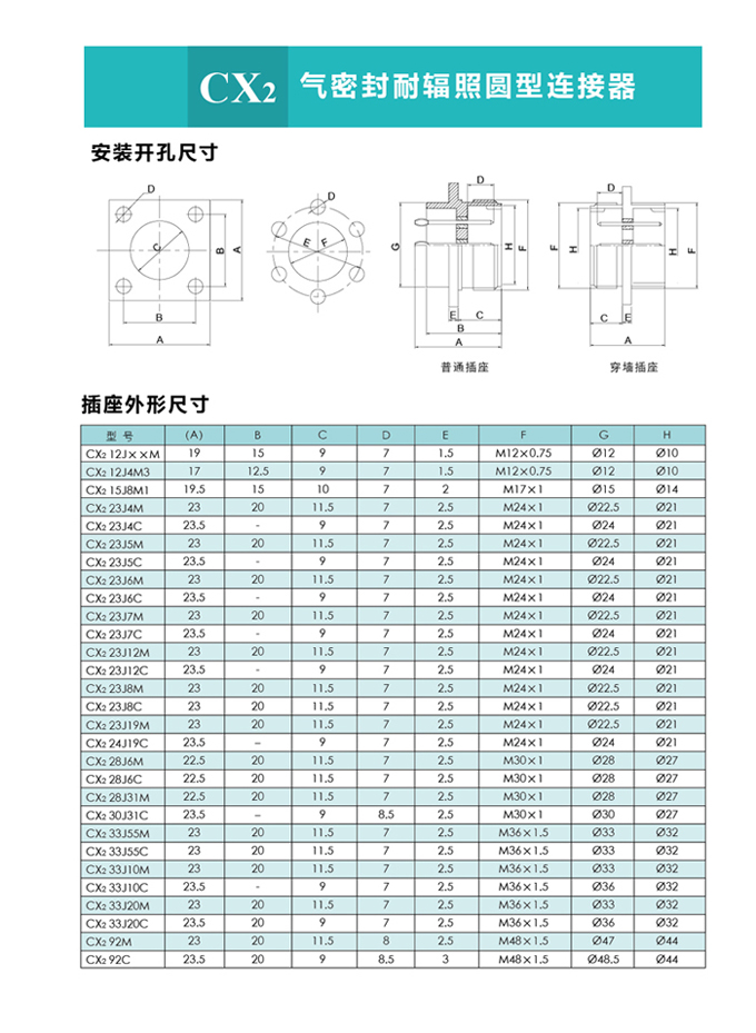 CX2系列氣密封圓形連接器,主要技術參數(shù)非等效采用美軍標MIL-C-26482G。 目前有七個殼體號,二十九個孔組數(shù),有非密封、密封和密封穿墻等品種。尾部附件有直式壓線式、護線管式、彎式壓線式和屏蔽式四個品種;除以上四種形式的尾部附件外,還設計了 種尾部附件形式,供用戶選用。 密封穿墻電連接器主要用于氣密座艙及其他電氣、無線電設備,需要保持氣密性能穿過墻壁的電連接。 CX2系列圓形真空氣密封航空插座, 廣泛應用于各種電子儀器、密封容器的子設備與電源之間的電路連接。該系列連接器的連接方式為螺紋鎖緊連接,使用方便。插座采用玻璃燒結工藝,氣密性好。