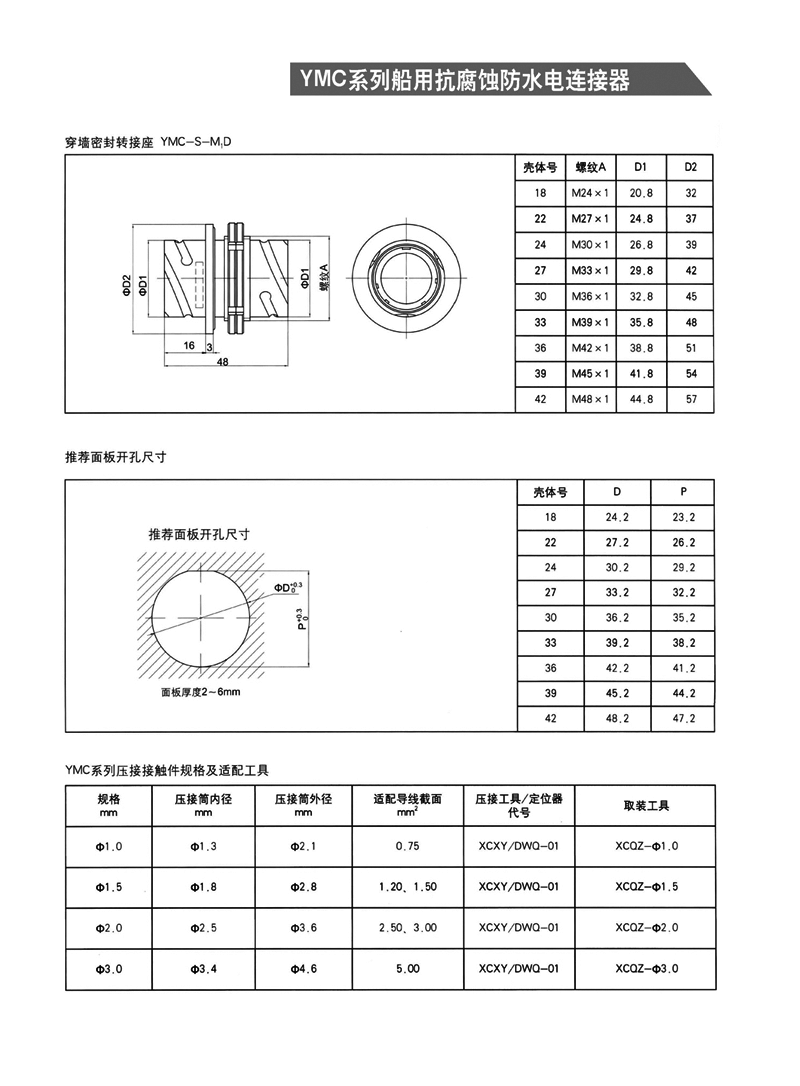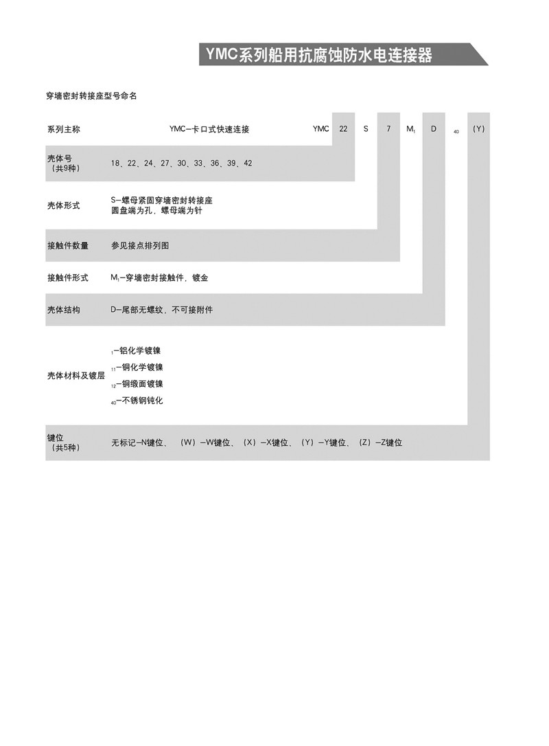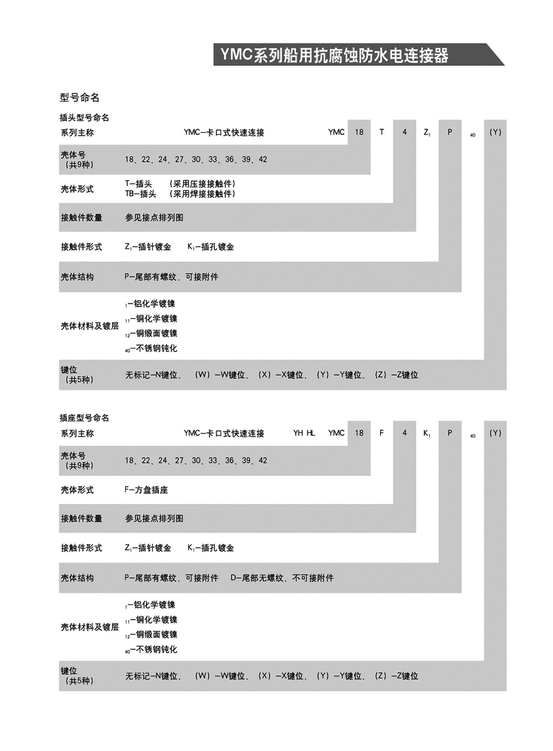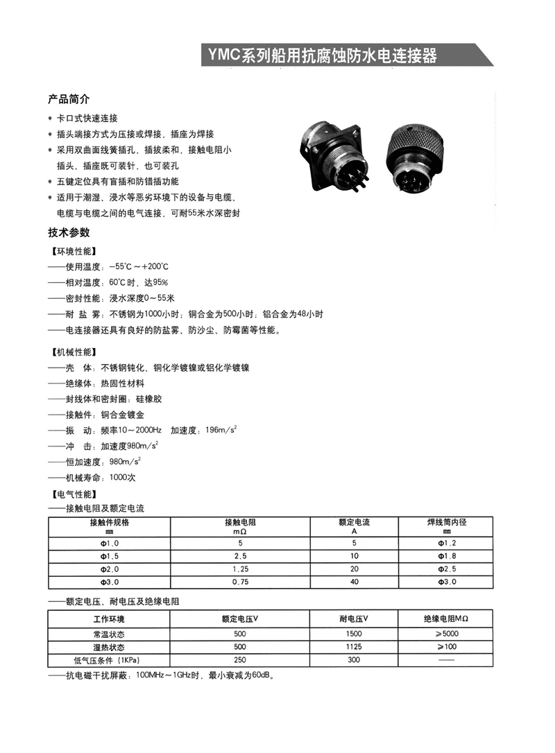 YMC系列船用抗腐防水電連接器, 1. 適用于潮濕、浸水等惡劣環(huán)境下的設(shè)備與電纜、電纜與電纜 之間的電氣連接 2. 可耐50米水深密封 3. 卡口式快速連接 4. 插頭端接方式為壓接,插座為焊接 5. 五鍵定位具有盲插和防錯(cuò)插功能 6. 高可靠的雙曲面線簧插孔使連接器插拔柔和,接觸電阻小 7. 插頭、插座既可裝針,也可裝孔。