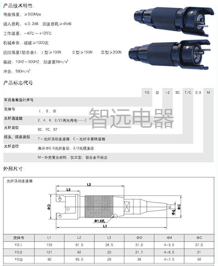 YG 4芯野外光纖(纜)連接器是光纖與光纖之間進行可拆卸(活動)連接的器件,它把光纖的兩個端面精密對接起來,以使發(fā)射光纖輸出 的光能量能最大限度地耦合到接收光纖中去,并使由于其介入光鏈路而對系統(tǒng)造成的影響減到最小,這是光纖連接器的基本要求。目前分對 接式和固定式,相互之間都能互插。是一種符合GJB1919標準的多芯、中性光纜連接器,可以是SC、FC、ST的任一類型,其連接方式為卡口 式快速連接和分離結(jié)構(gòu),陶瓷套管定位,特別是外殼采用優(yōu)質(zhì)鋁合金材料或復合材料制成,具有抗振、耐壓、防鹽霧、防塵、防雨等性能, 廣泛應用于軍用光纖通信網(wǎng)絡(luò)、軍用計算機系統(tǒng)、核電領(lǐng)域和多種車載、機載、艦載等設(shè)備。