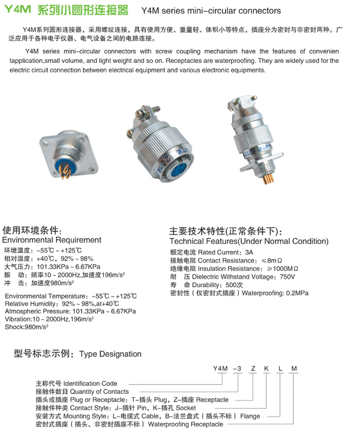 Y4系列圓形螺紋連接航空插頭接方式為螺紋連接,體積小,重量輕、插座密封、使用方便。安裝方式有法蘭盤式和電纜式兩種。廣泛用于小儀器,小設備,無需安裝空間線路之間的連接。防淋雨,防腐,是外面線路連接的好幫手。